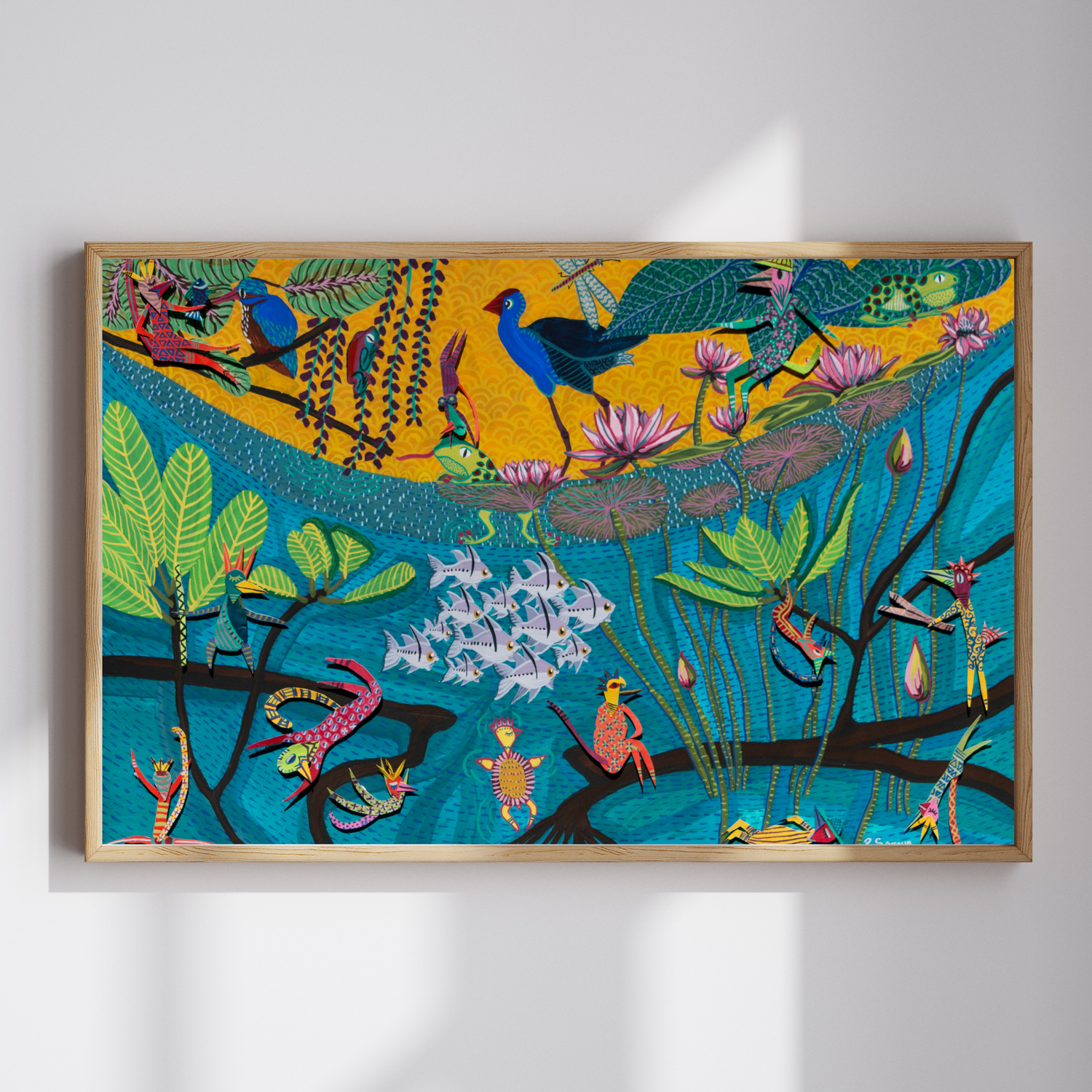 A watery realm of hidden depths, shaped in gouache paintings and mixed media art during 2020’s quiet days. This Robyn Sorour art piece draws you into a textured swirl of subtle tales, where ‘mannatjies’ dart through an underwater world. A still swamp reveals a vibrant, intricate ecosystem—peek beneath to spot these cheeky figures weaving secrets into the layers, all crafted with a sharp brush and a playful eye.