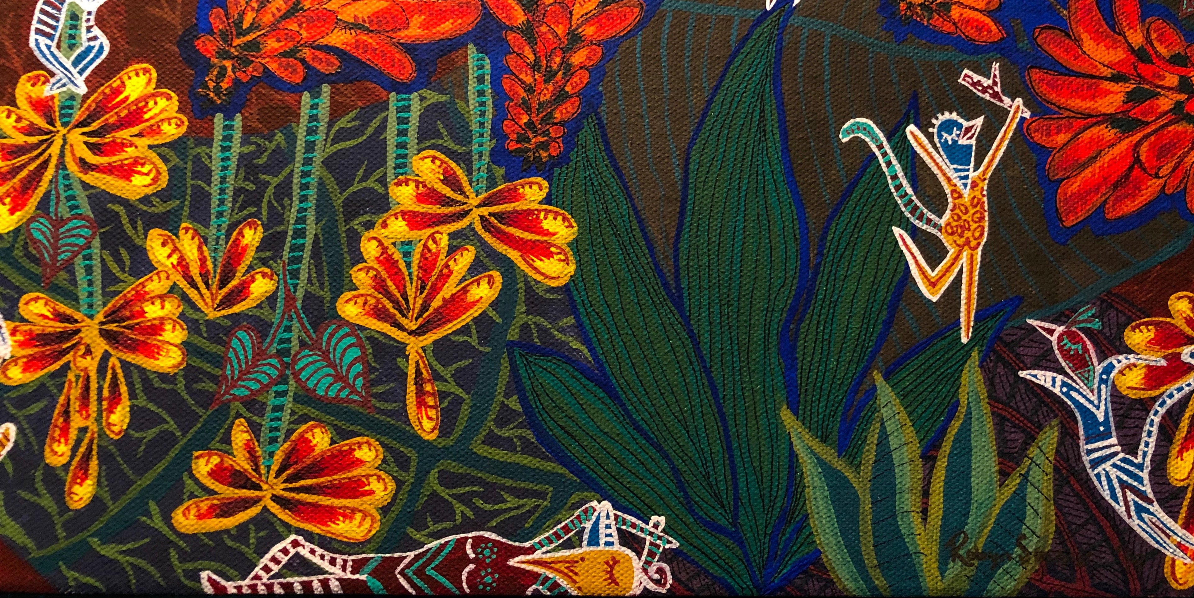 Robyn’s process is a creative adventure, rooted in gouache paintings that burst with bold strokes and rich textures. She layers in mixed media art, weaving delicate cut-outs and fine liner details into her little worlds. Lately, she’s been dabbling in acrylic paintings, adding dynamic depth to her already vivid palette. Each piece reflects an obsession with color—expressive, intricate, and alive. And then there are the ‘mannatjies’—those cheeky little figures that sneak into her work. Joyful, sometimes mischievous, they’re the signature touch that invites you to linger and smile.