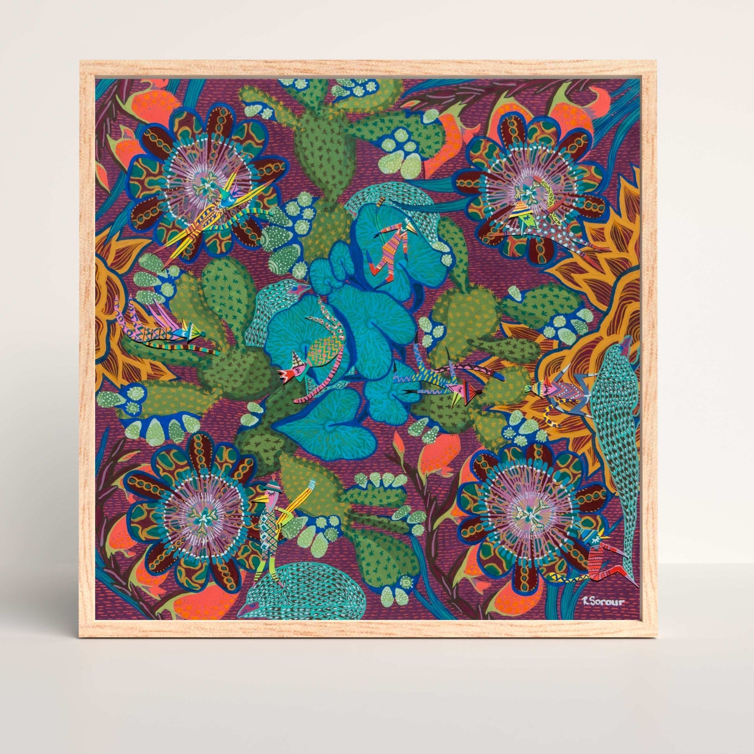 In the calm of 2020’s lockdown, ‘Pangolin Paradise’ came alive. This gouache painting and mixed media art spills over with color and playful spirit, a bright shout against those hushed days. Robyn Sorour’s signature ‘mannatjies’ mingle with quirky pangolins, shaping a Robyn Sorour art world that’s pure, vibrant fun. Step into this lively scene—a little universe where every stroke whispers joy with a knowing nudge.